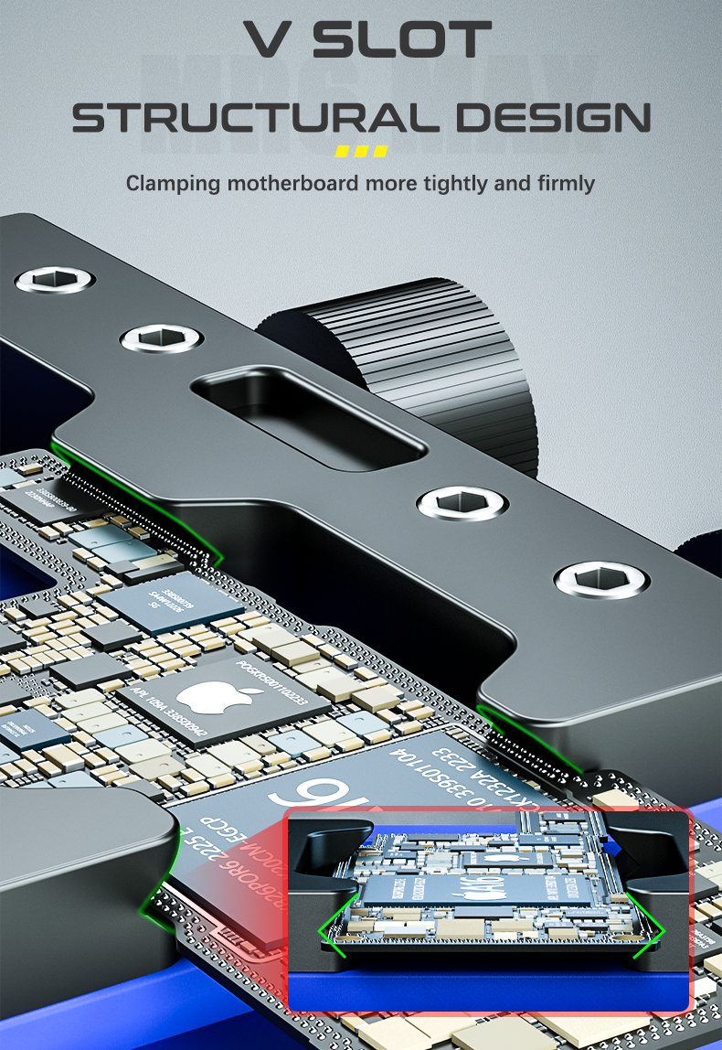 - MR6 Max motherboard repair dual-axis clamps, V-slot structure clamps, and trapezoidal slot structure clamps, clamping the motherboard more closely and firmly